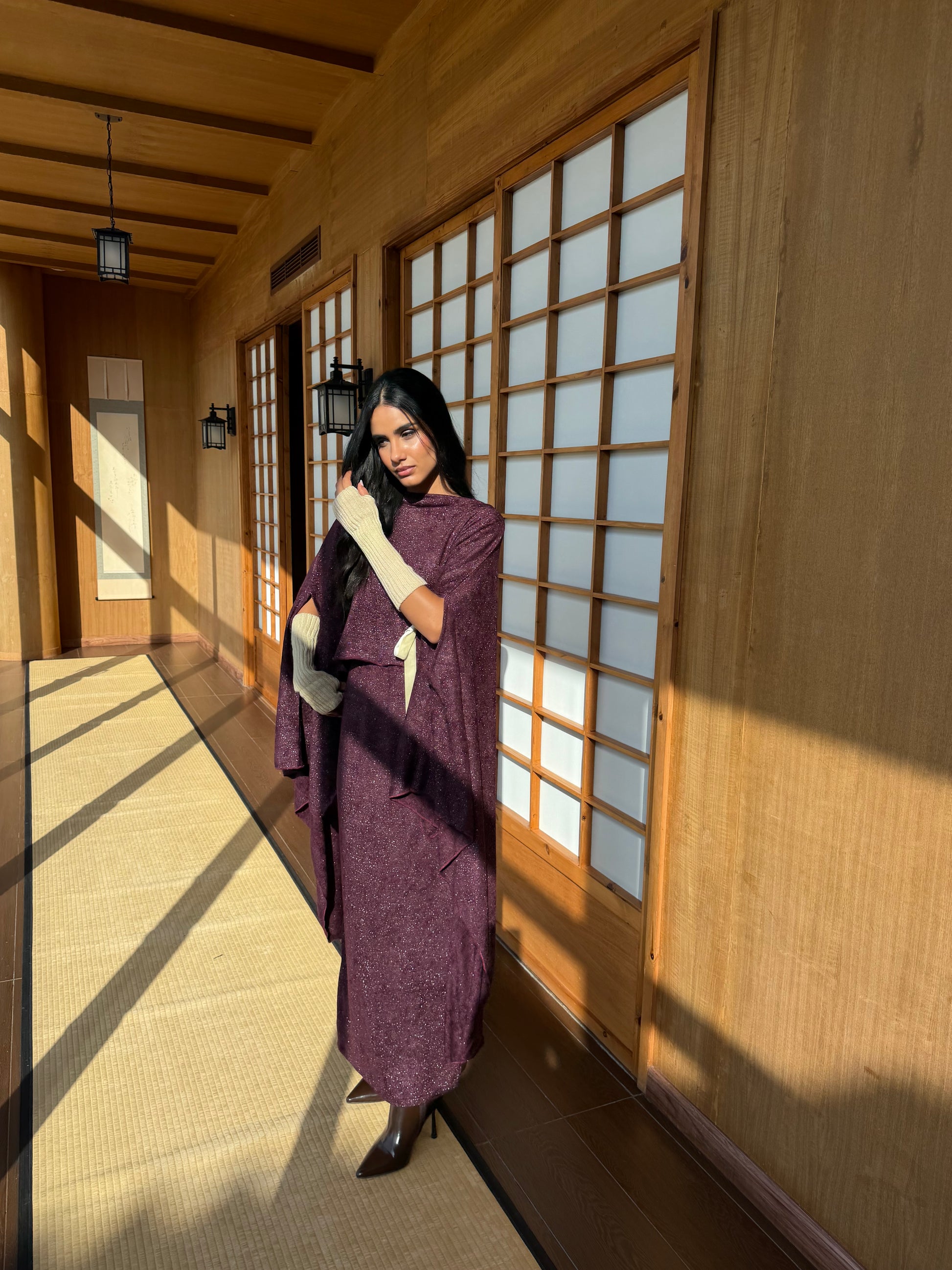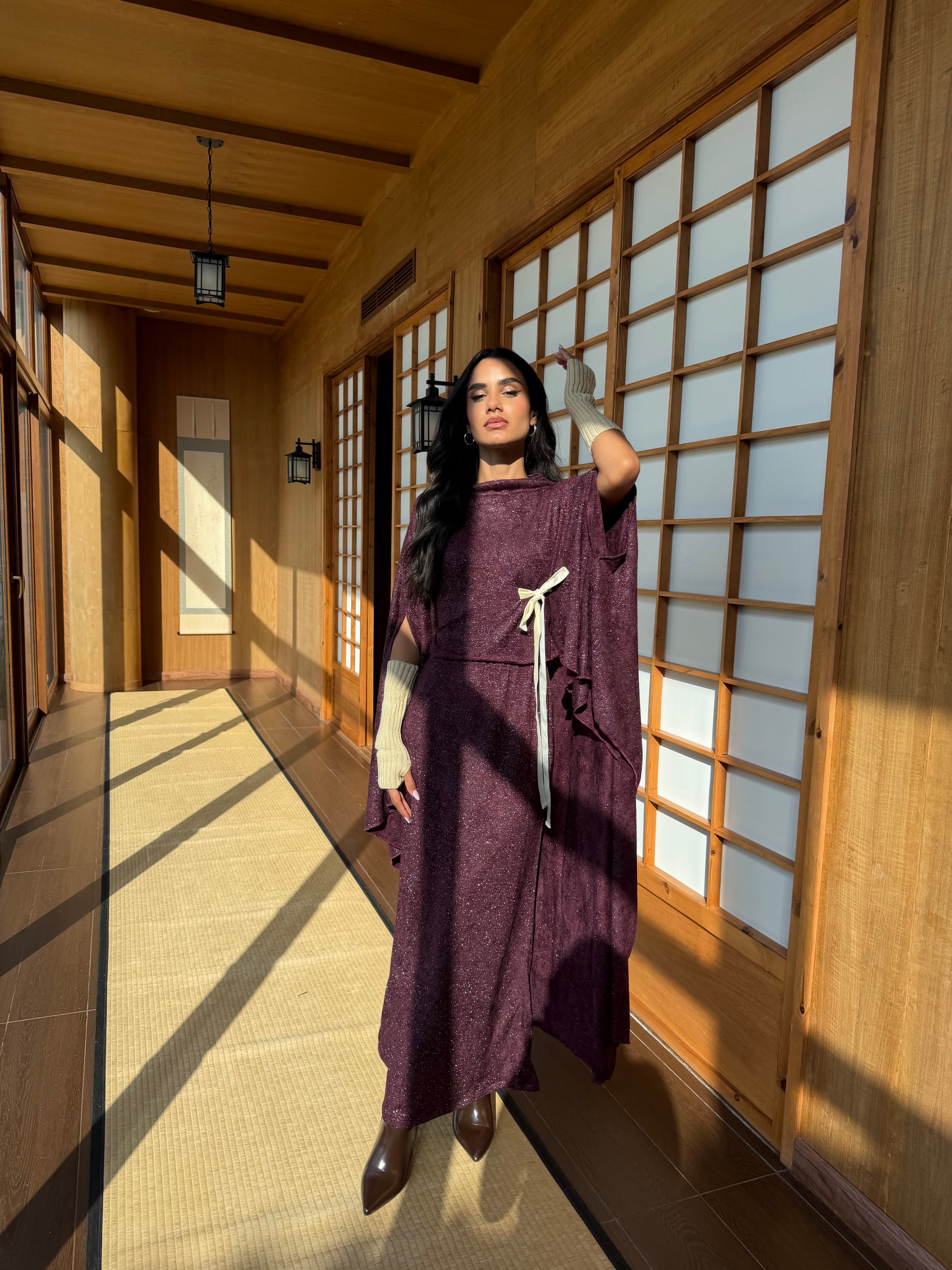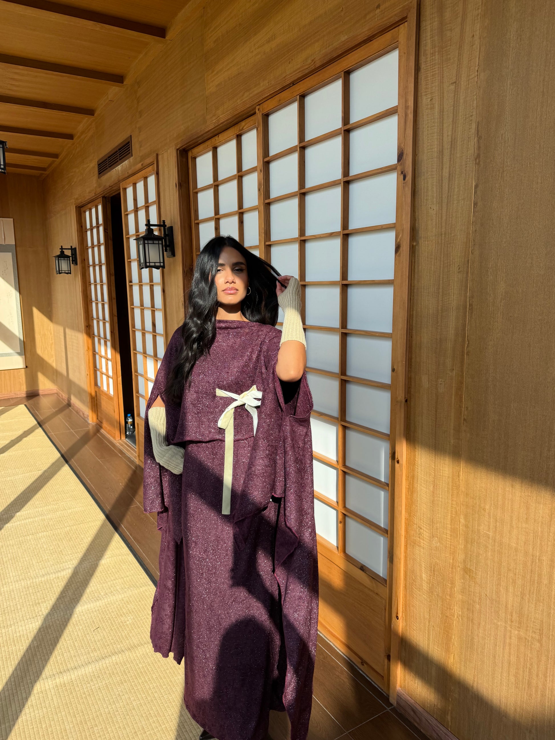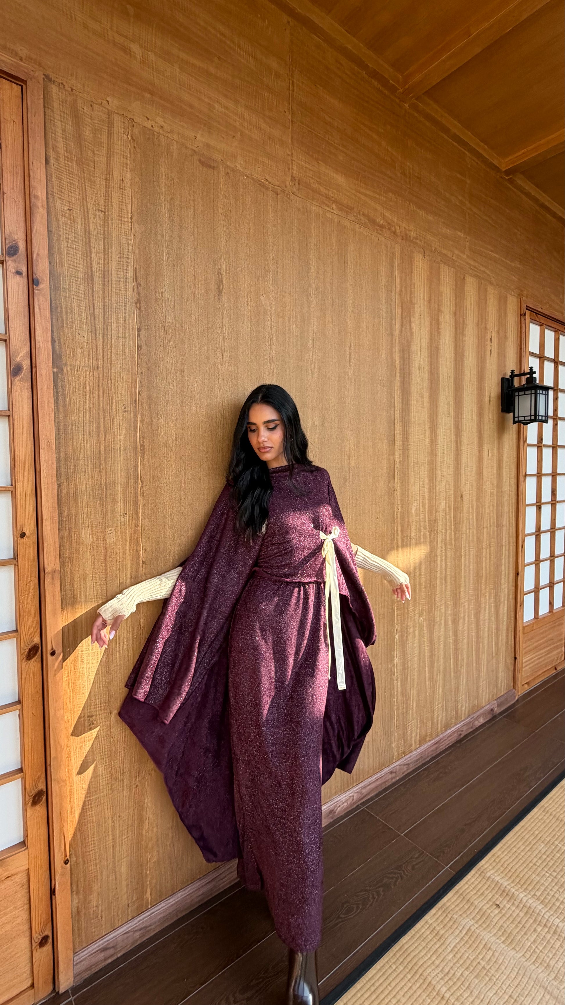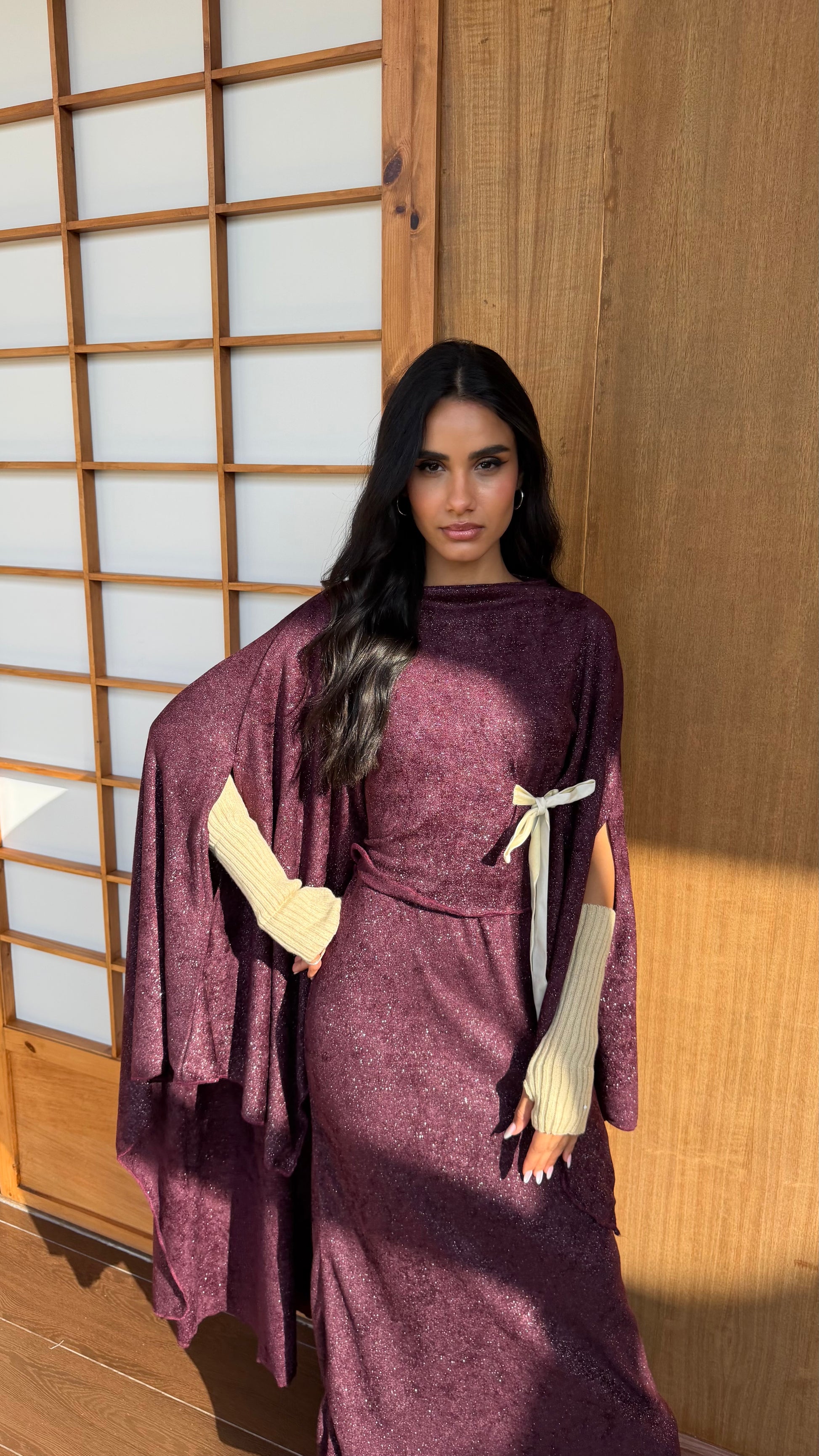 An elegant flowing top designed with a soft draped silhouette and cape-style sleeves. Featuring a flattering wrap detail at the waist, finished with a contrasting tie for subtle definition. Crafted to move effortlessly with you — timeless, refined, and elevated for both day and evening wear