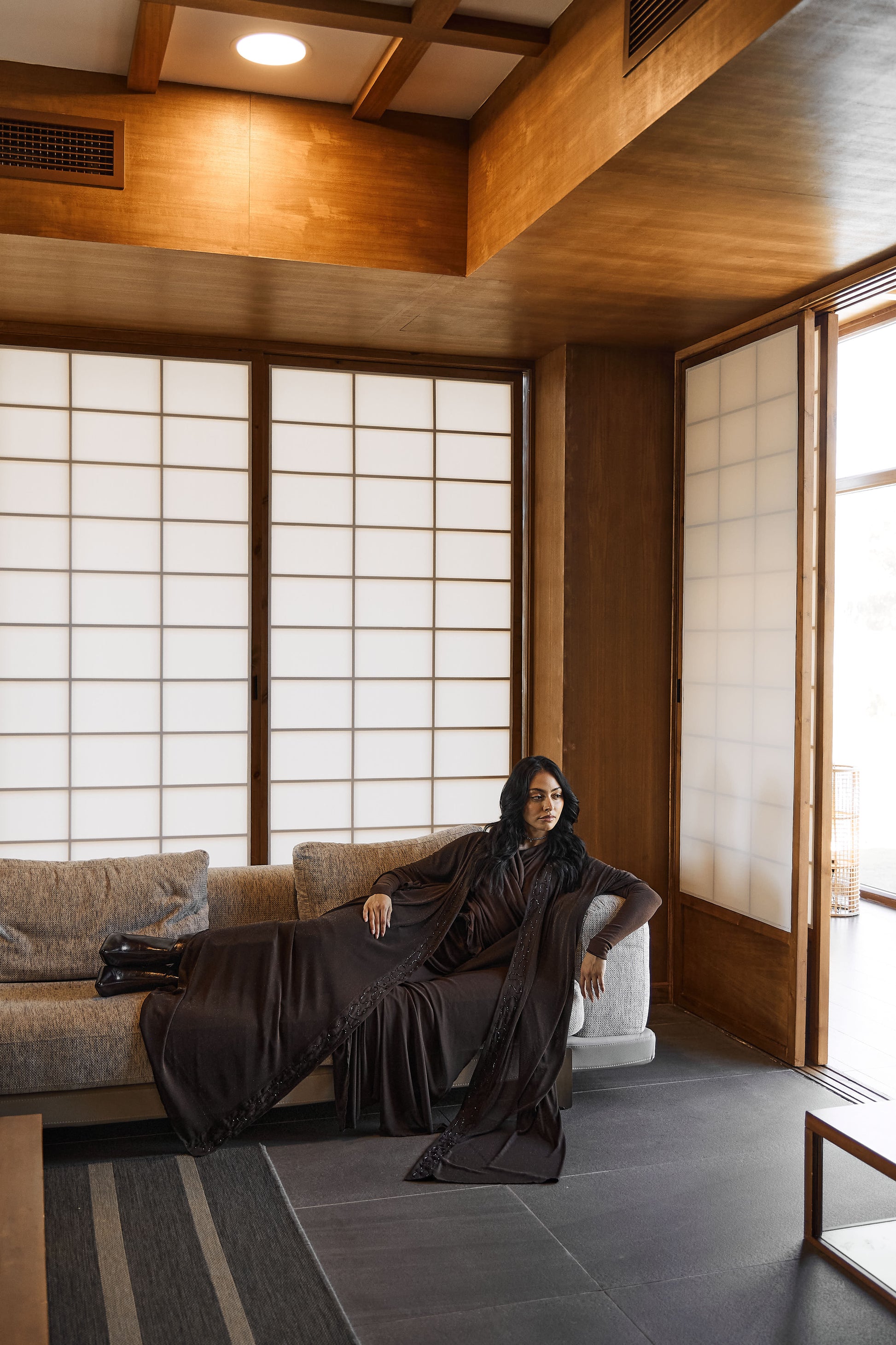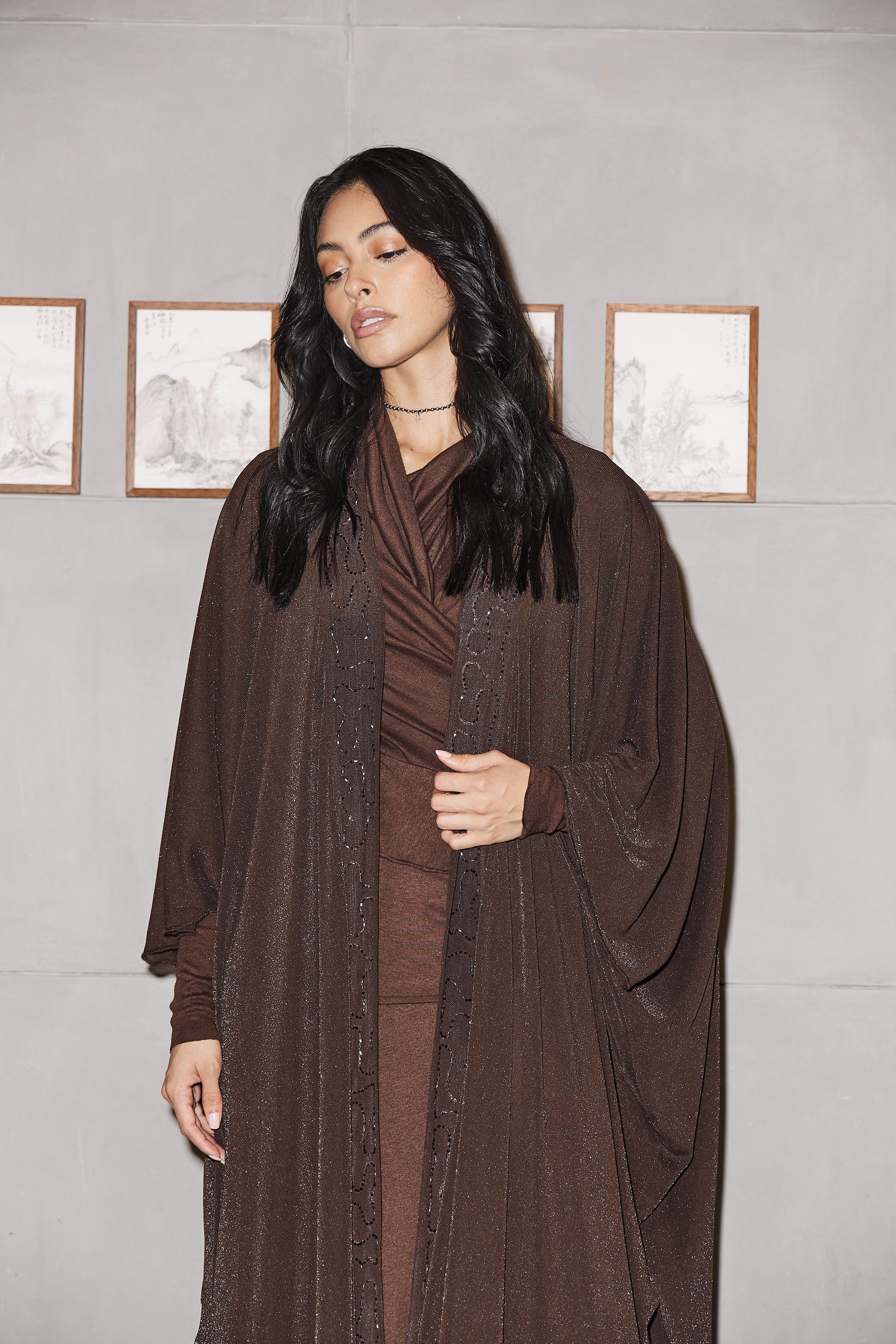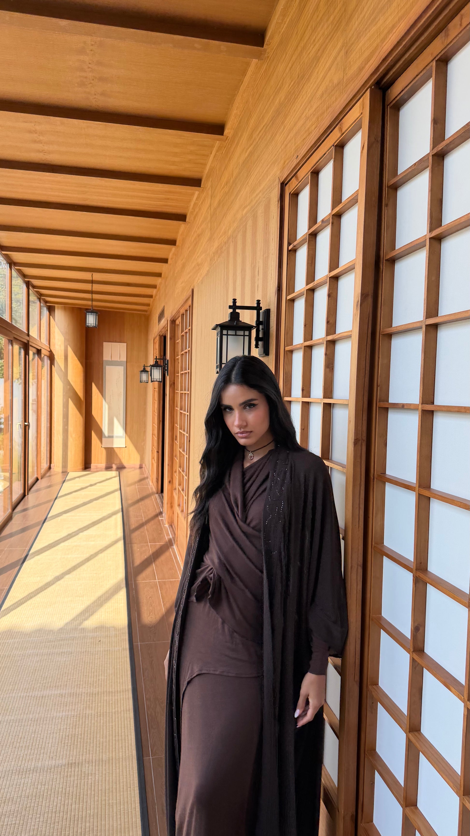 An elegant three-piece set featuring a wrap-style top, wide-skirt, and a lightweight outer layer with delicate beaded spiral detailing. Designed for effortless Ramadan sophistication.