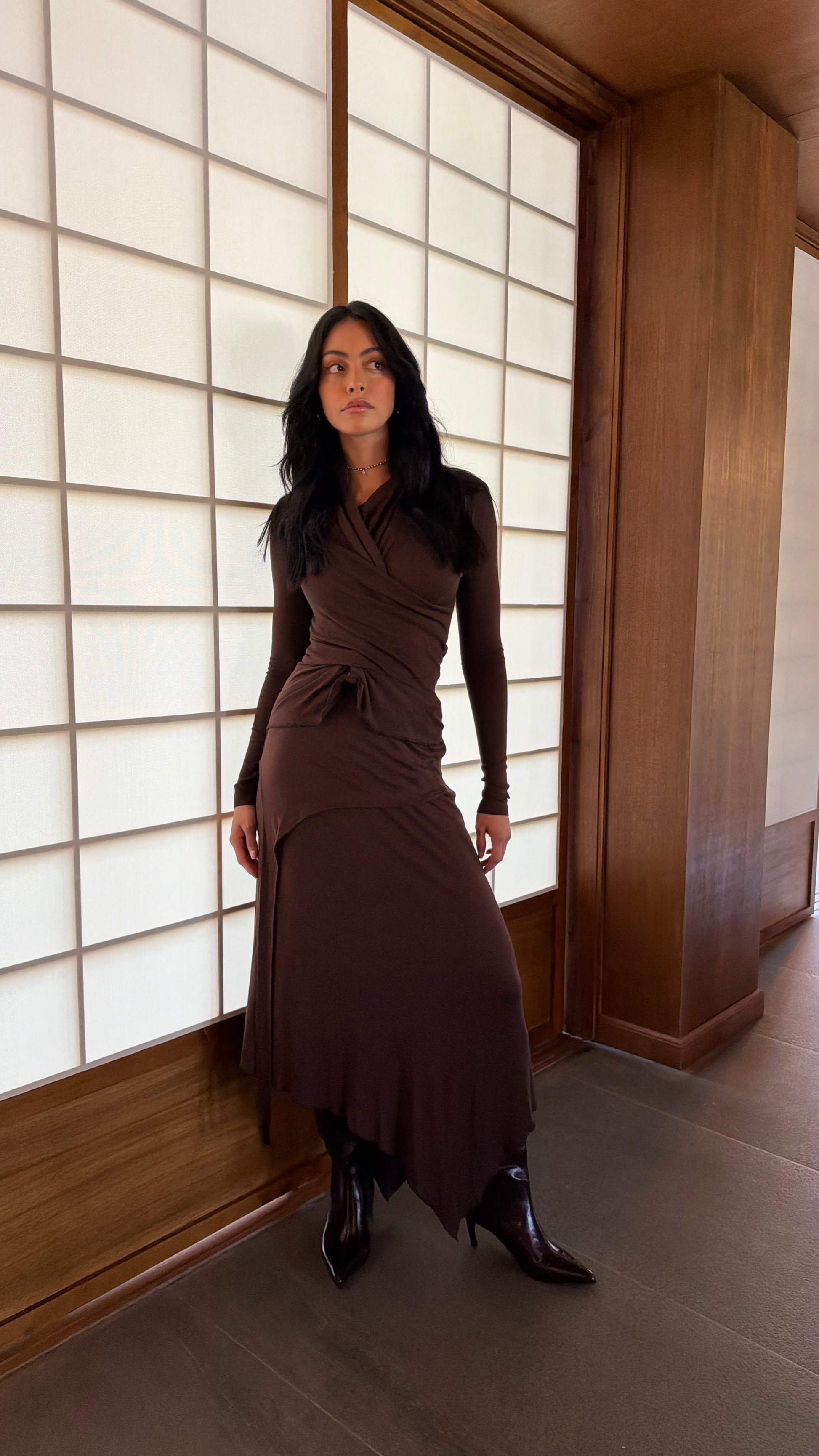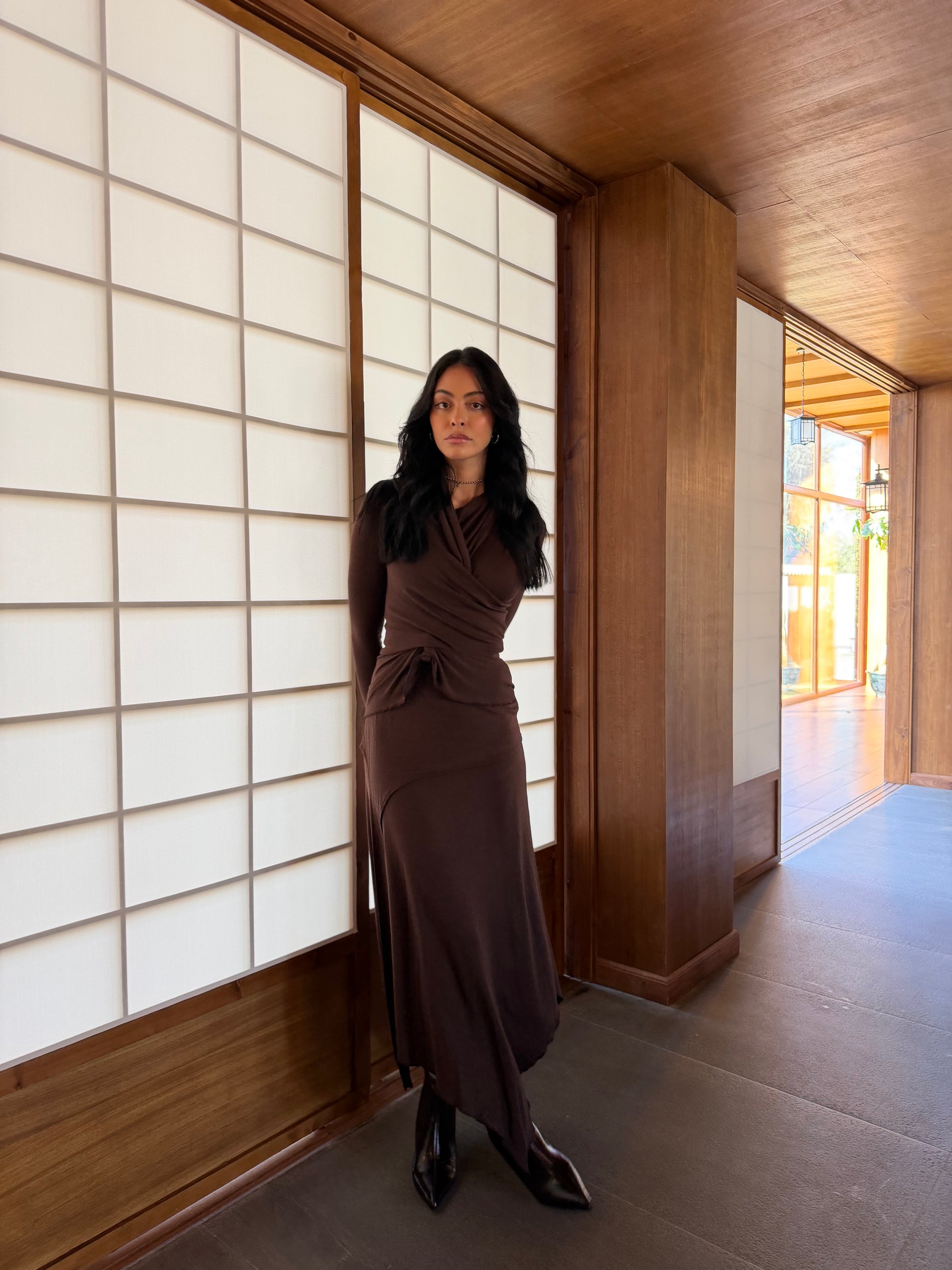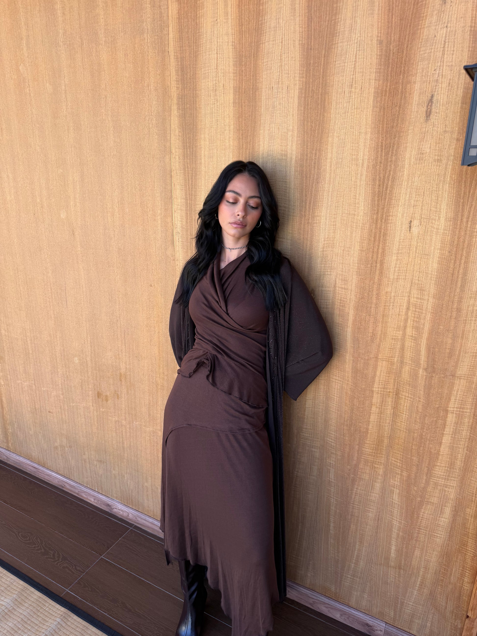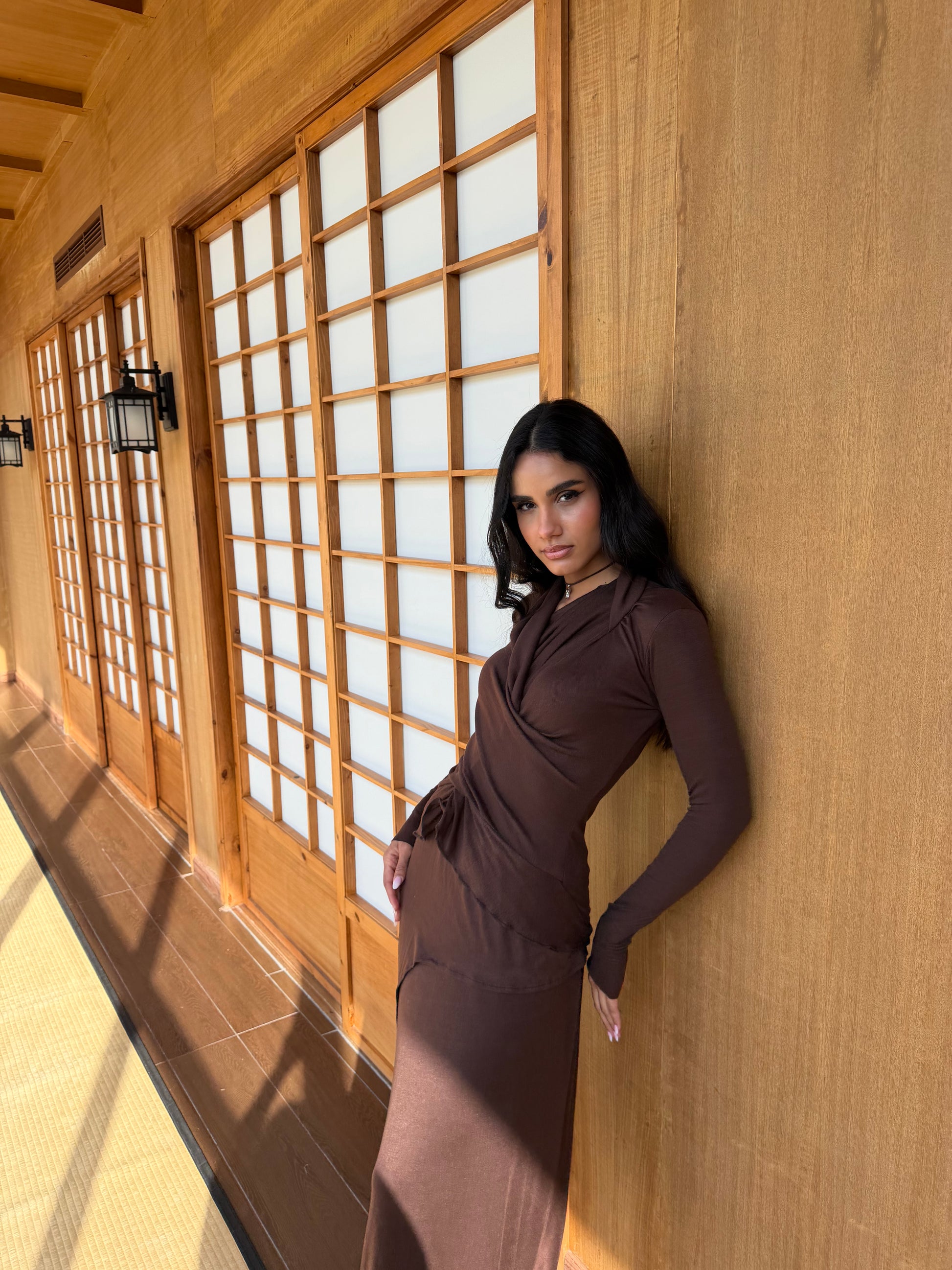 An elegant three-piece set featuring a wrap-style top, wide-skirt, and a lightweight outer layer with delicate beaded spiral detailing. Designed for effortless Ramadan sophistication.