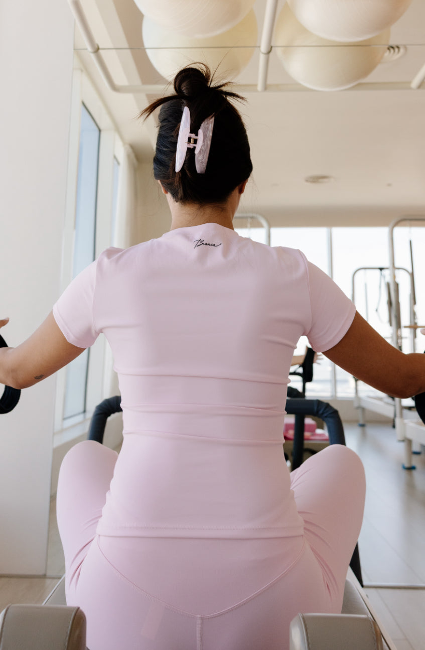 Bianca’s baby pink gym top—soft, breathable, and effortlessly chic for every move.