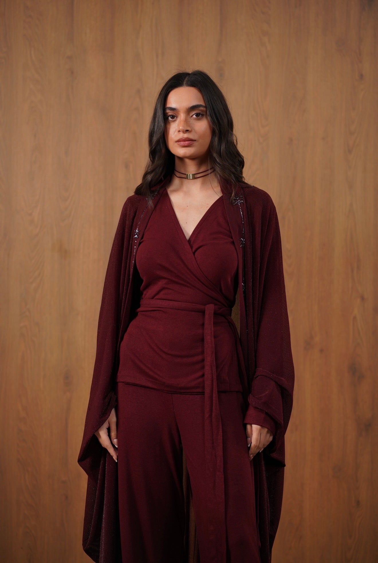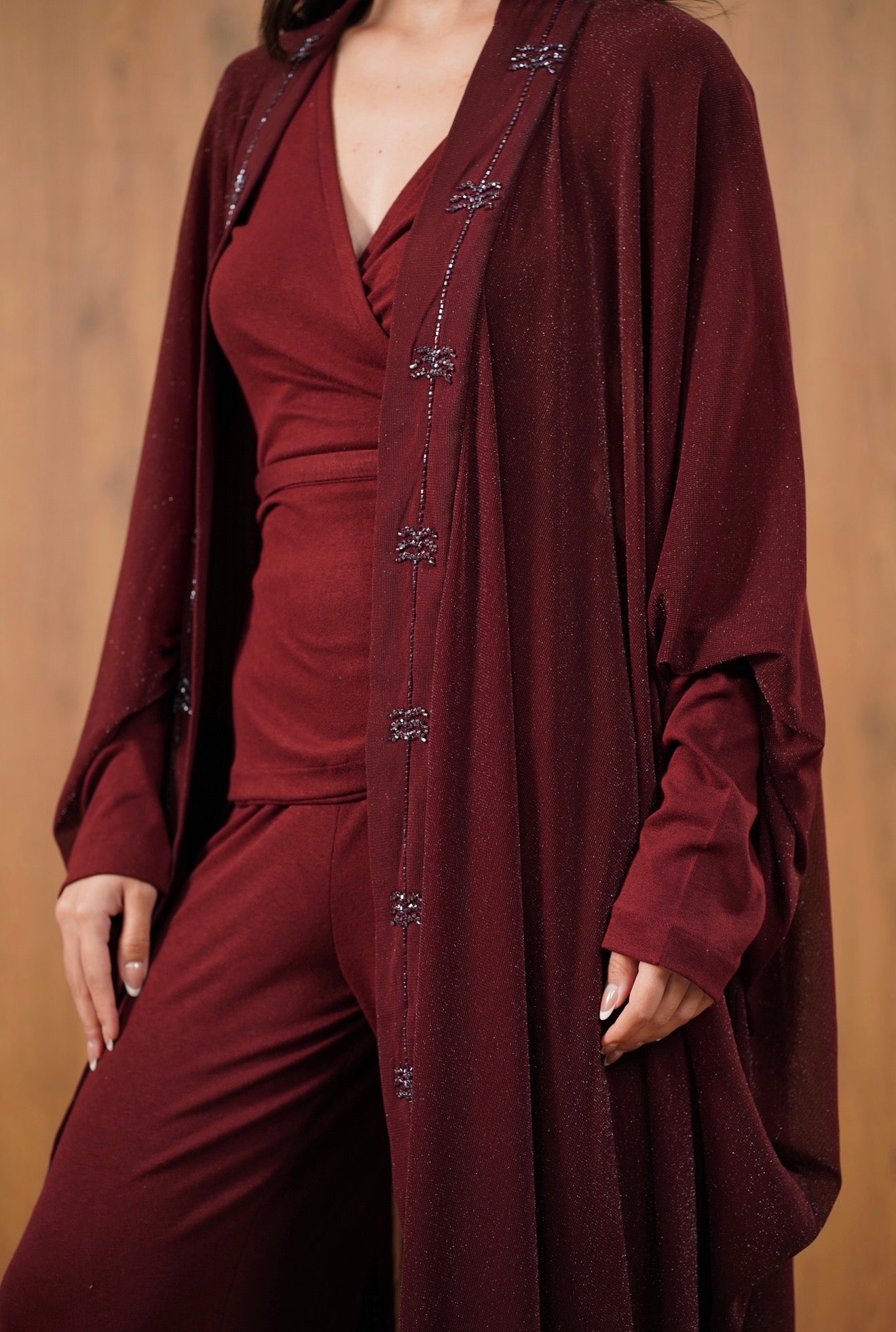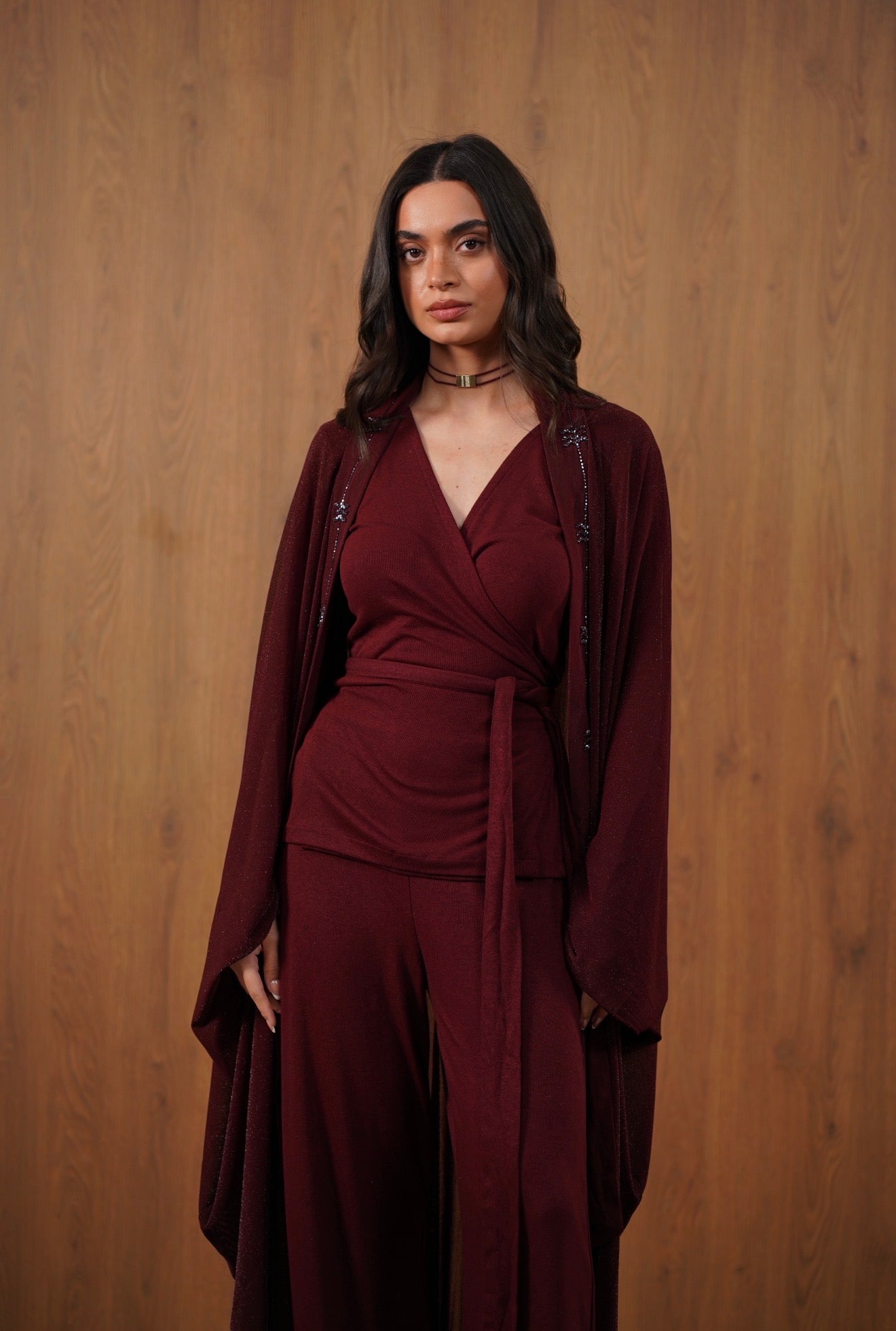 An elegant three-piece set featuring a wrap-style top, wide-leg pants, and a lightweight outer layer with delicate beaded palm detailing. Designed for effortless Ramadan sophistication.