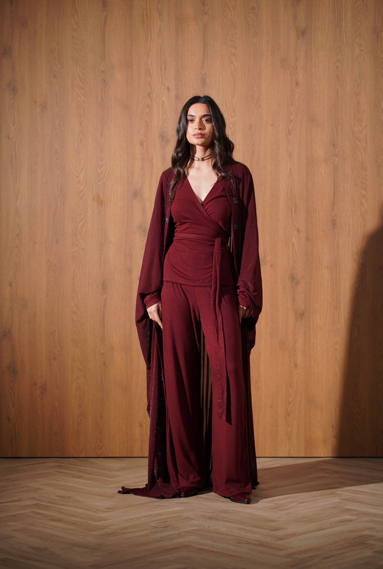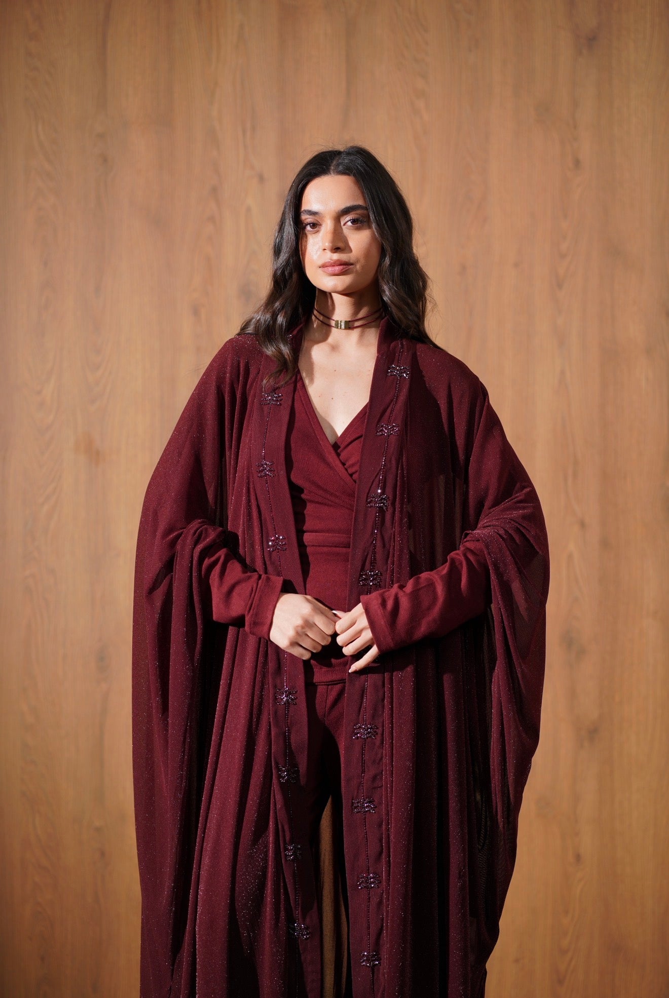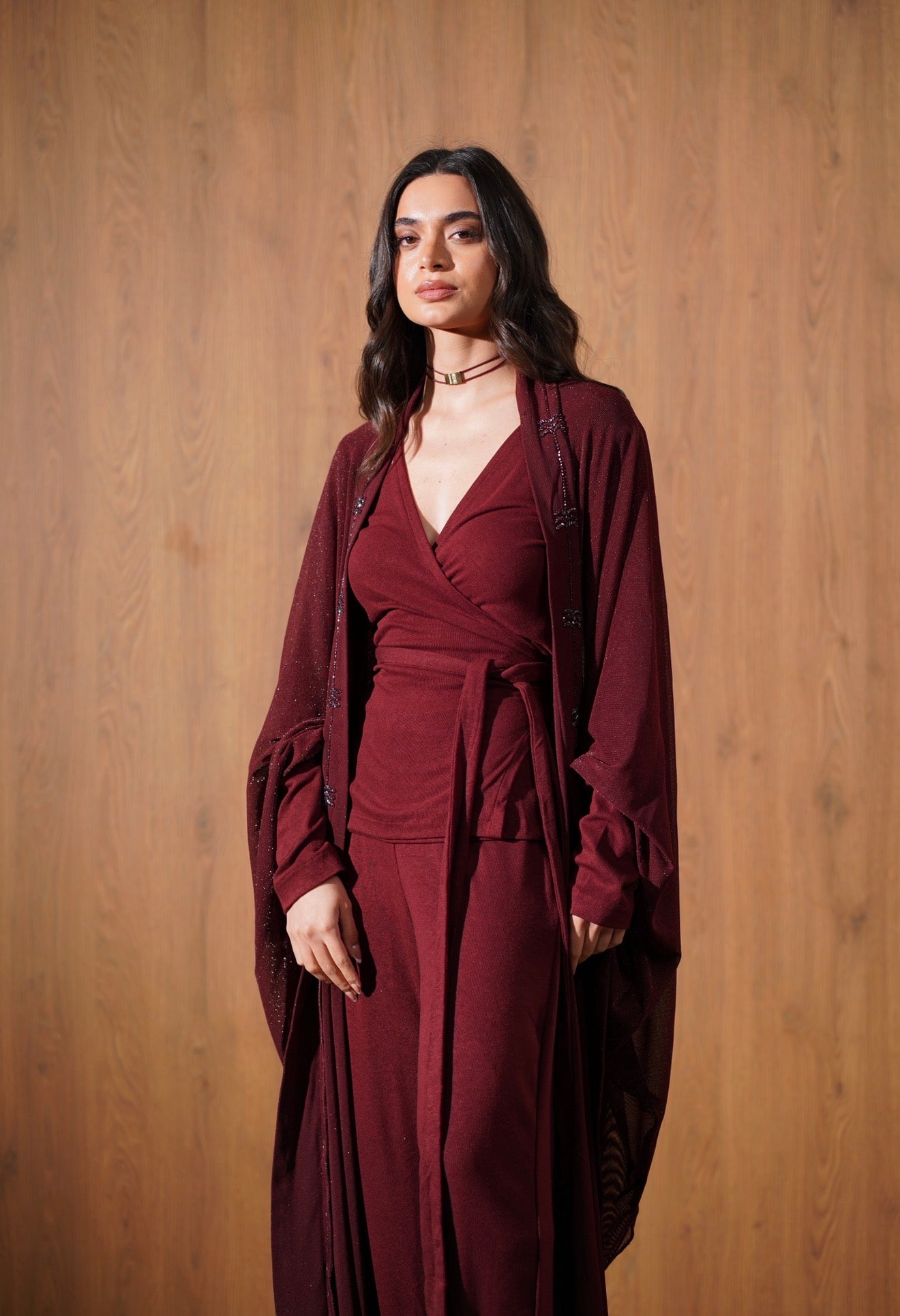 An elegant three-piece set featuring a wrap-style top, wide-leg pants, and a lightweight outer layer with delicate beaded palm detailing. Designed for effortless Ramadan sophistication.