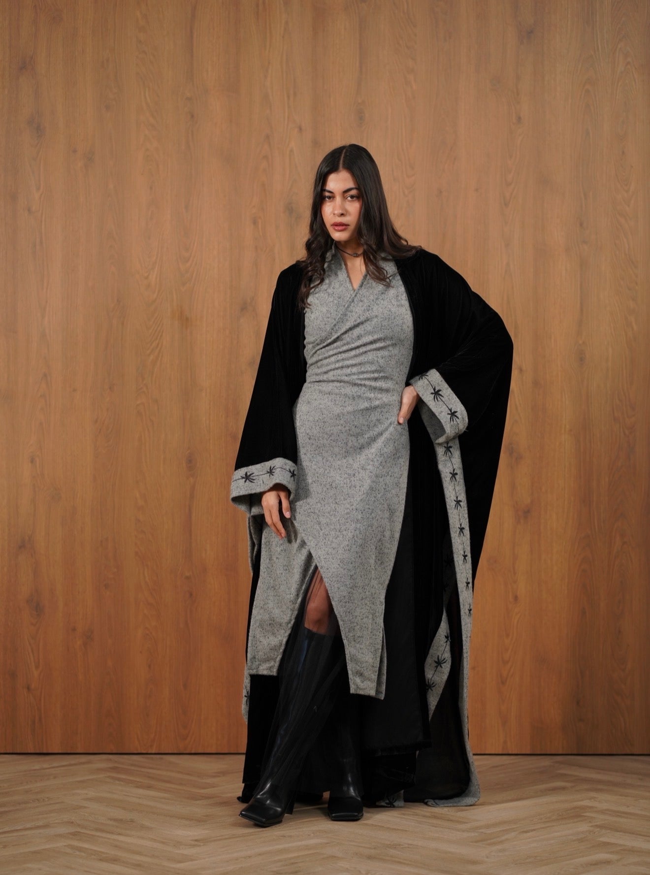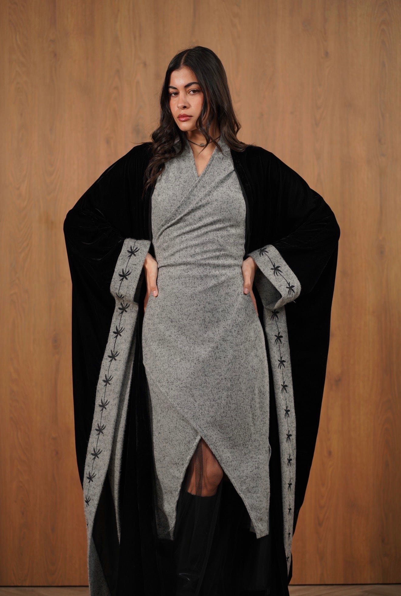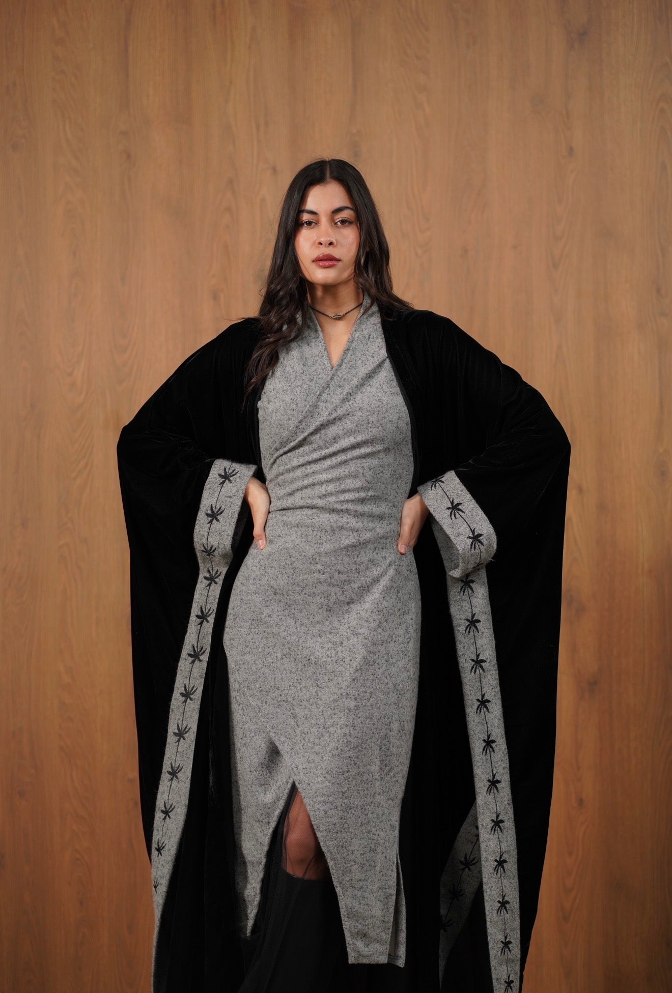 A chic two-piece set featuring a soft wrap dress paired with a flowing open abaya. Designed for comfort and effortless elegance, finished with subtle embroidered sleeve details.