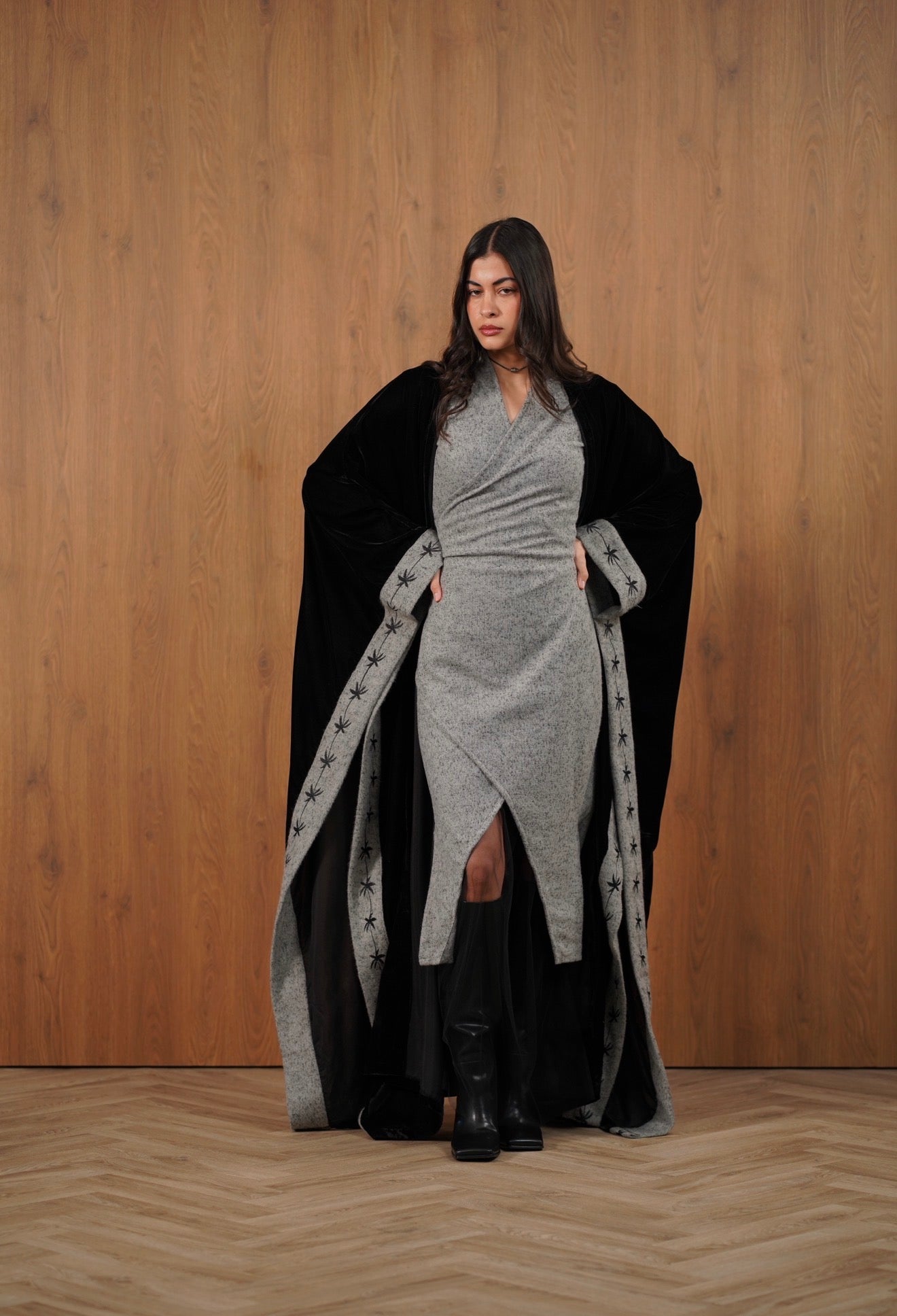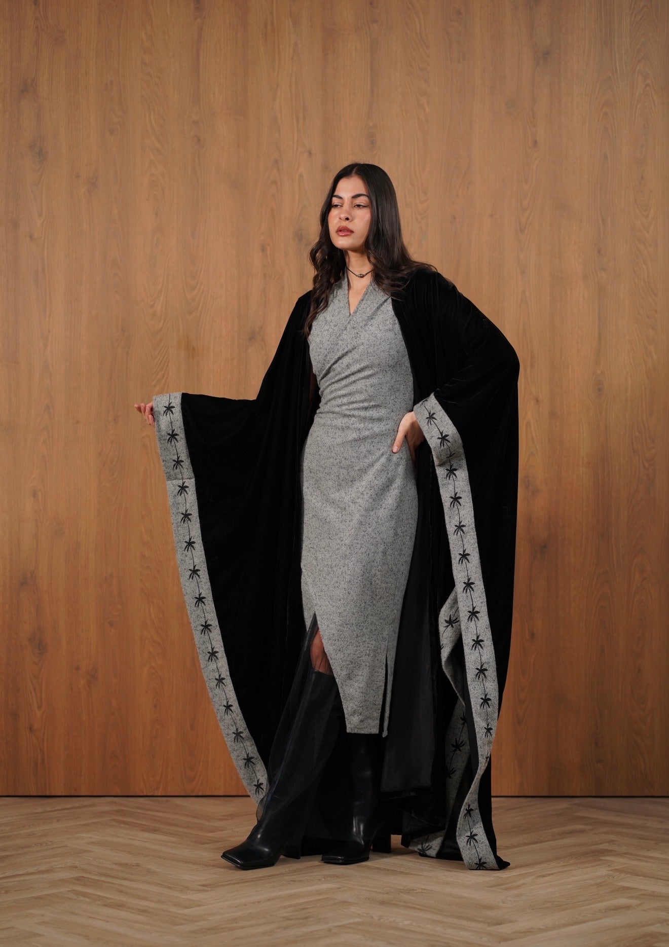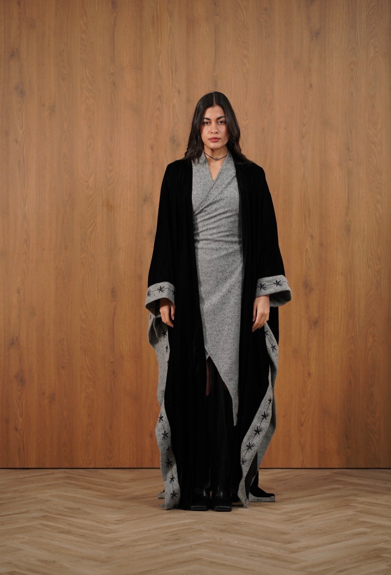 A chic two-piece set featuring a soft wrap dress paired with a flowing open abaya. Designed for comfort and effortless elegance, finished with subtle embroidered sleeve details.