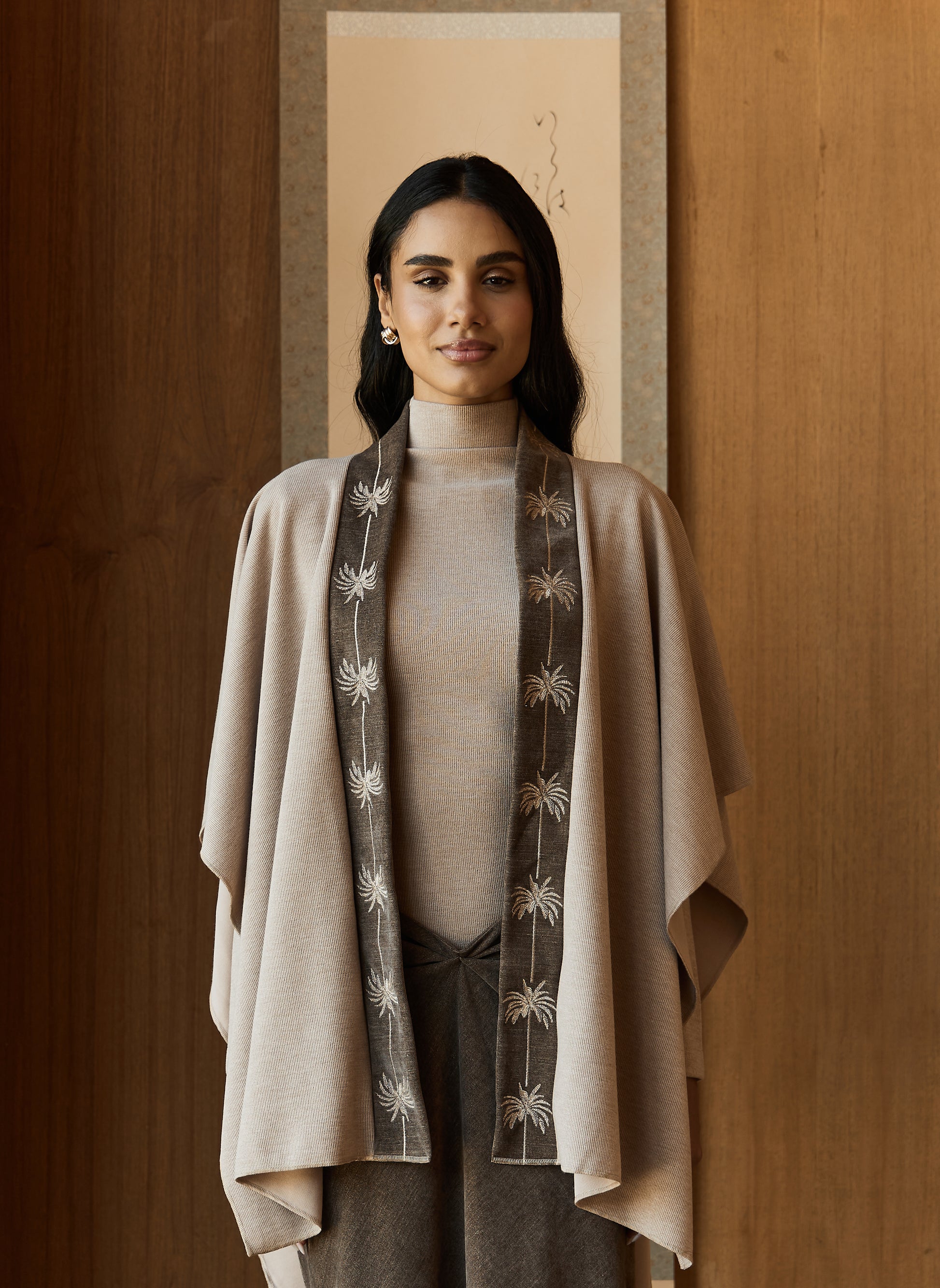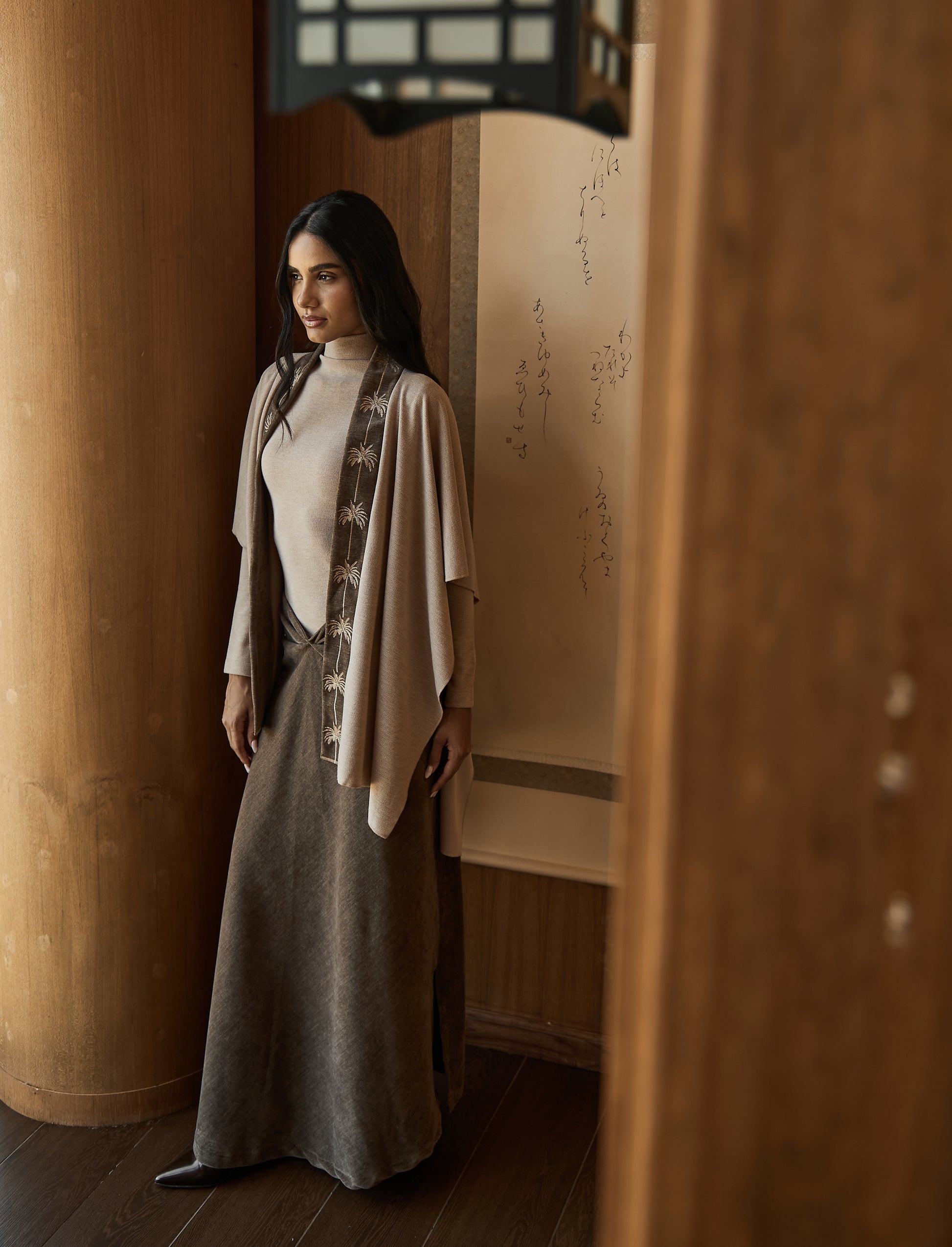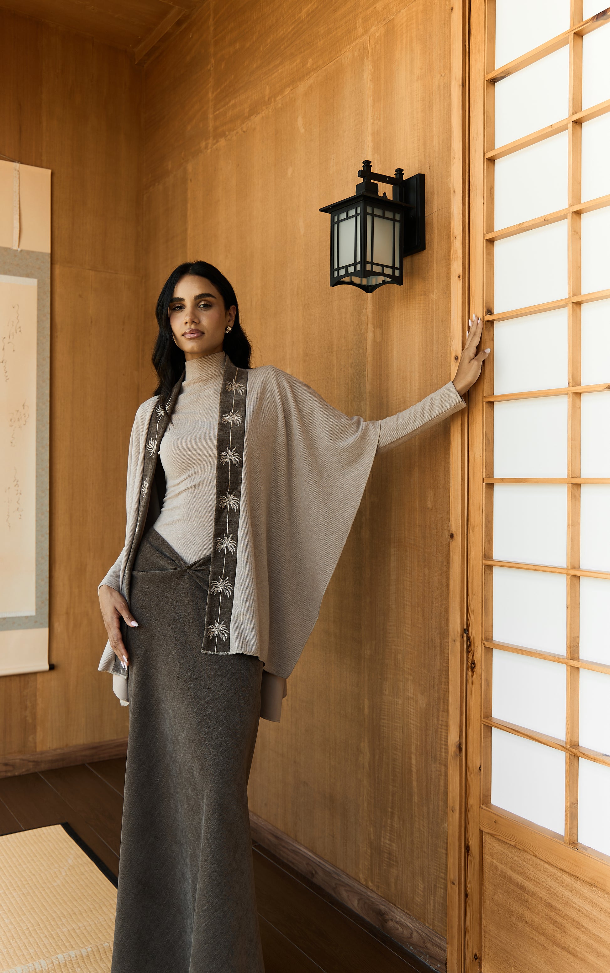 A timeless three-piece set featuring a softly draped top, flowing maxi skirt, and an embroidered scarf. Designed in elegant neutral tones for effortless Ramadan sophistication.