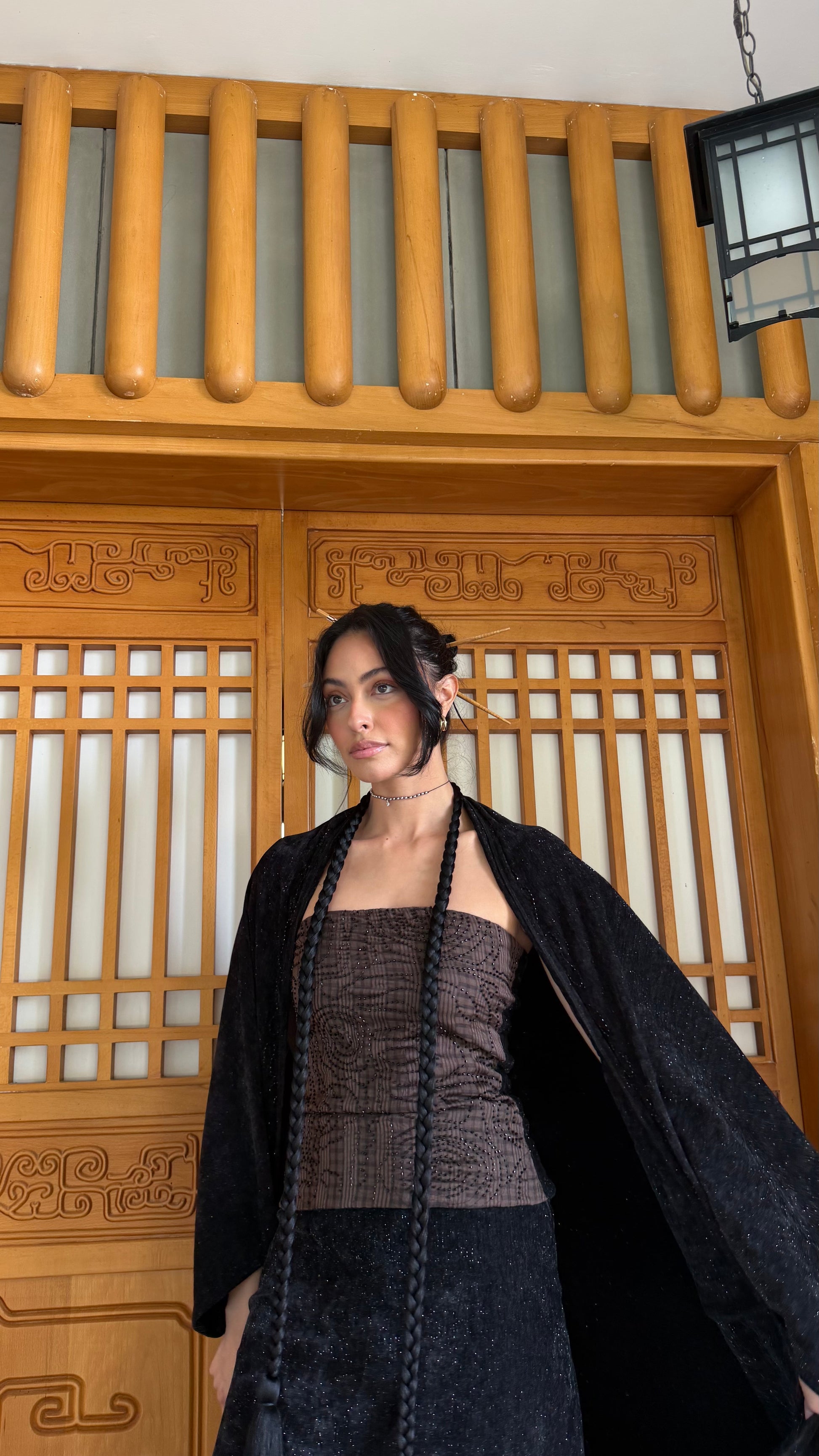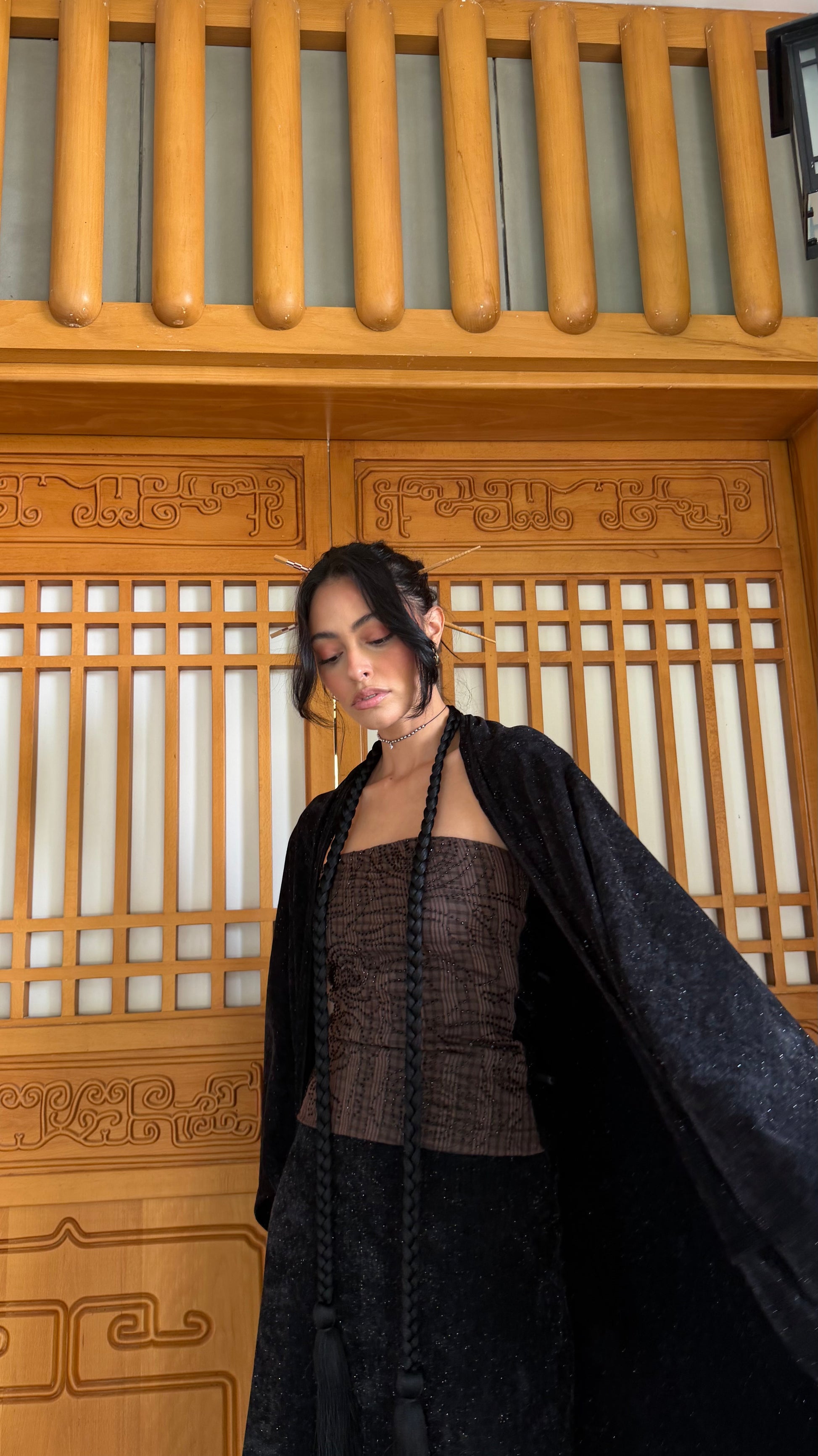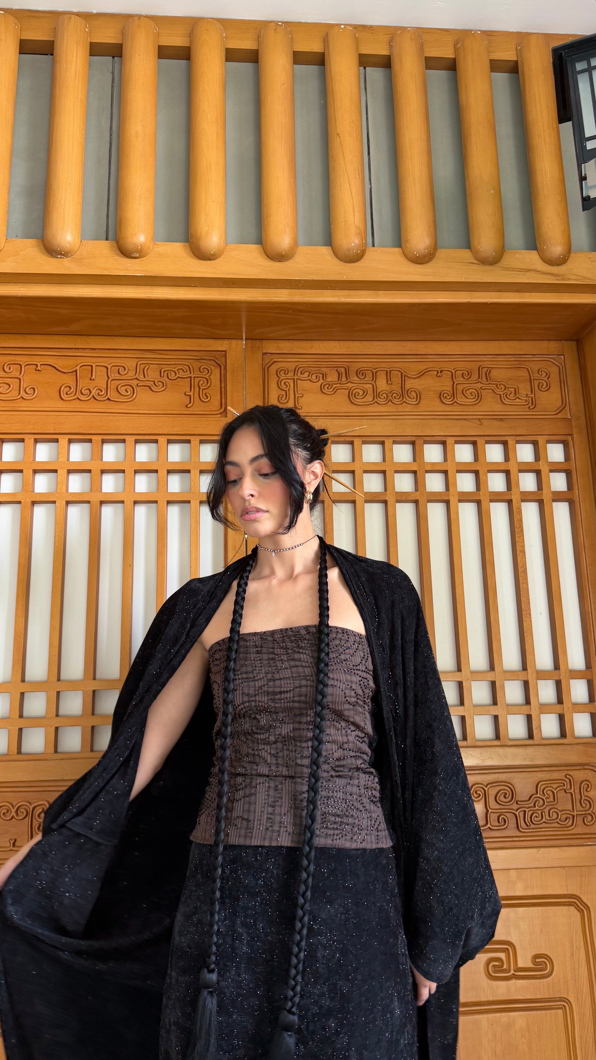 An elevated evening set designed with understated glamour. Featuring a textured strapless top, a flowing maxi skirt, and a sheer draped outer layer that adds soft movement and depth. Finished in deep, luminous tones, this set is perfect for Ramadan nights, special gatherings, and refined occasions.
