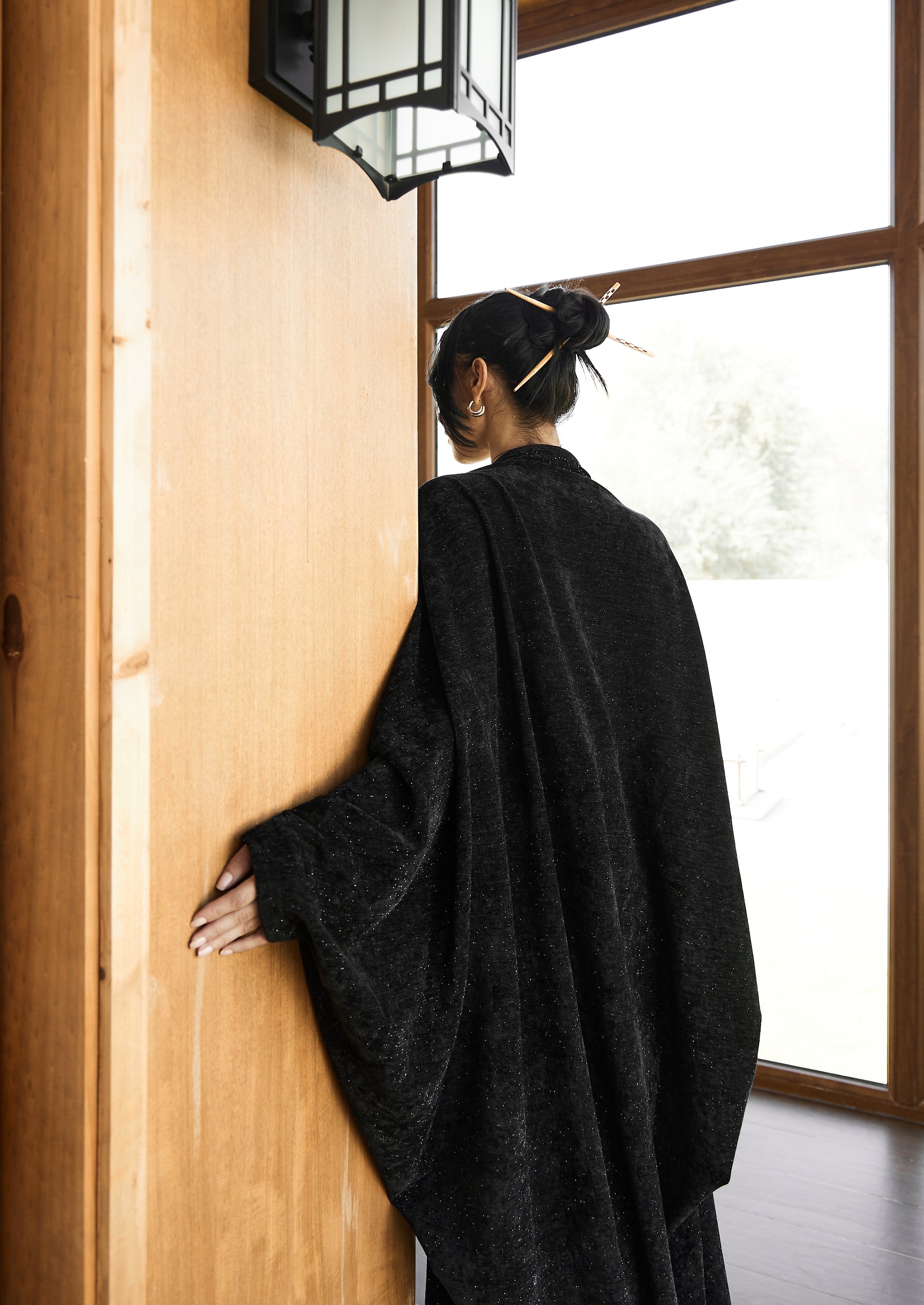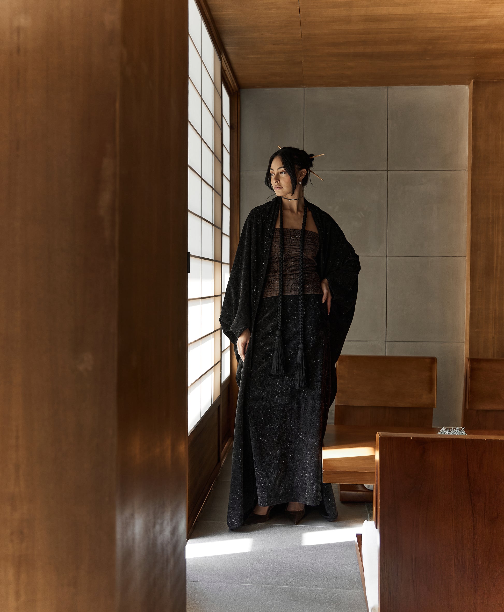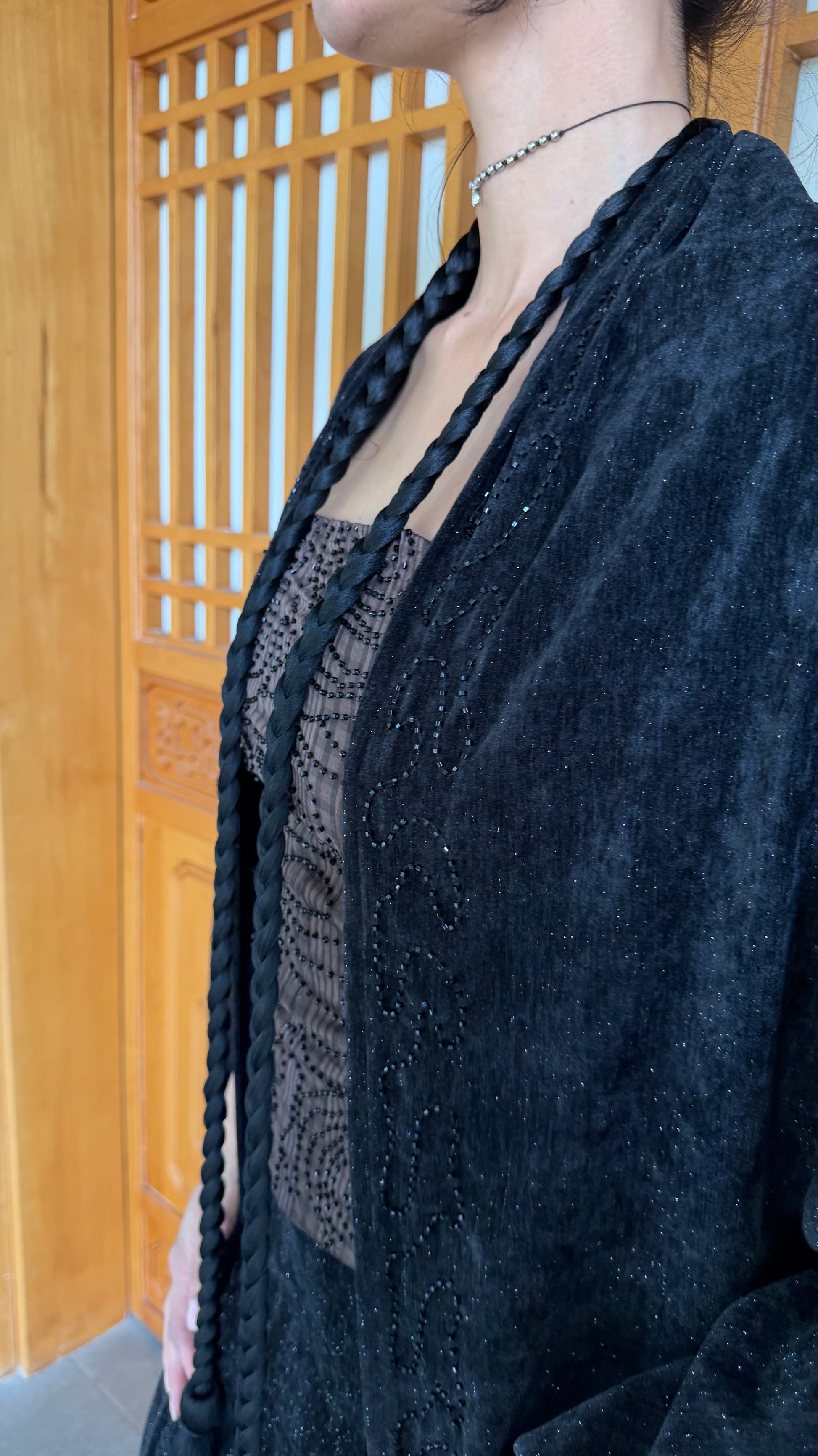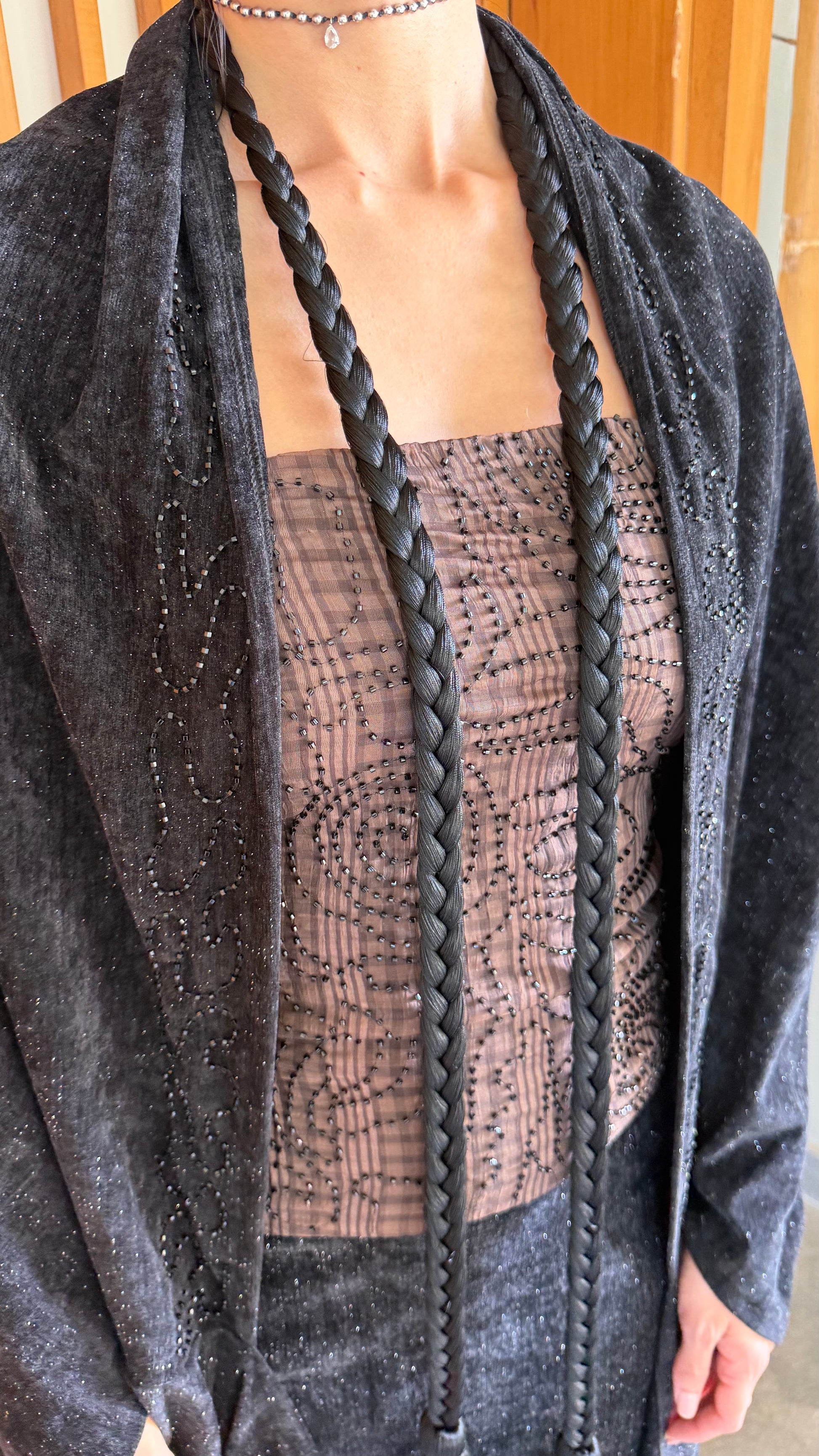 An elevated evening set designed with understated glamour. Featuring a textured strapless top, a flowing maxi skirt, and a sheer draped outer layer that adds soft movement and depth. Finished in deep, luminous tones, this set is perfect for Ramadan nights, special gatherings, and refined occasions.