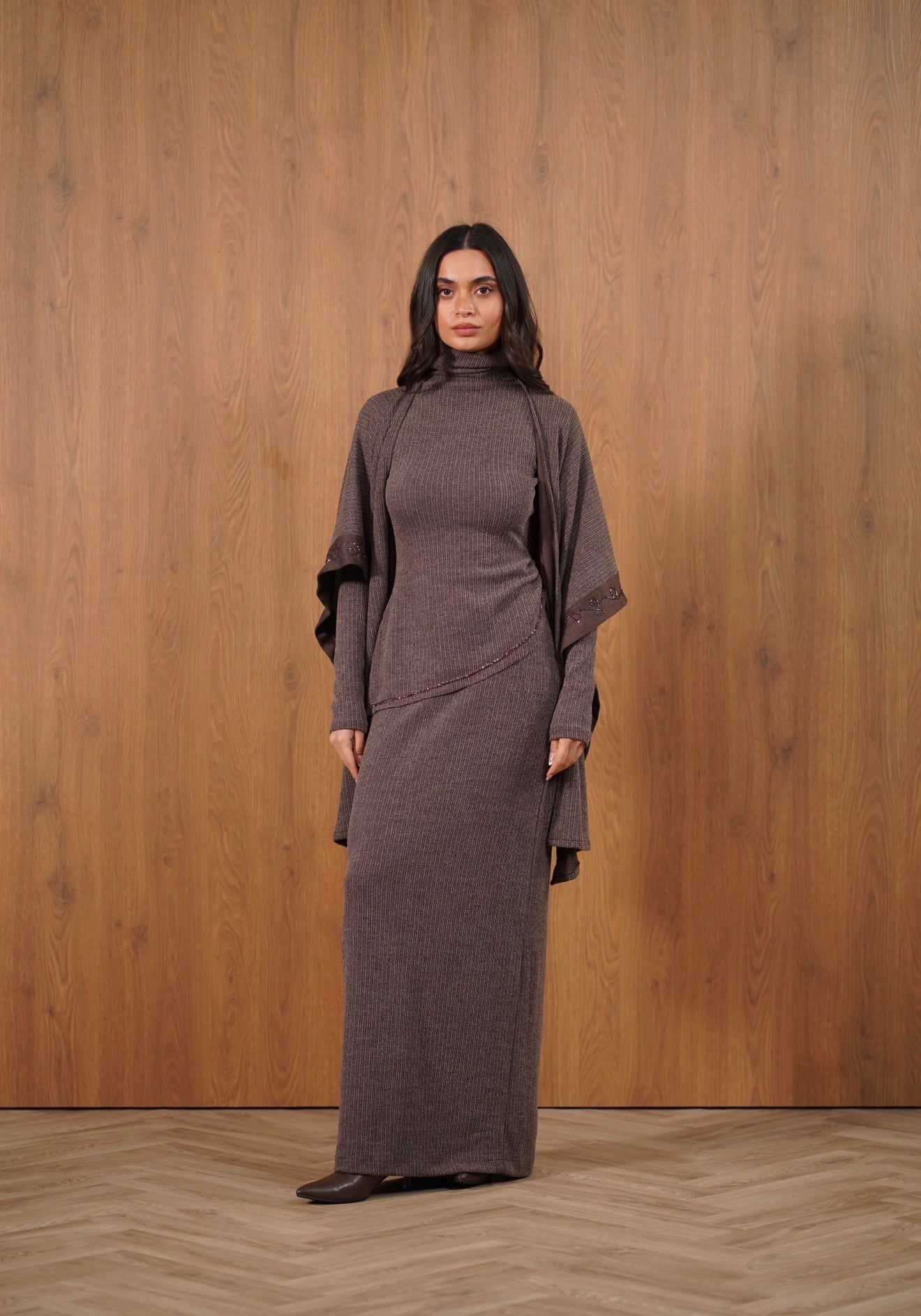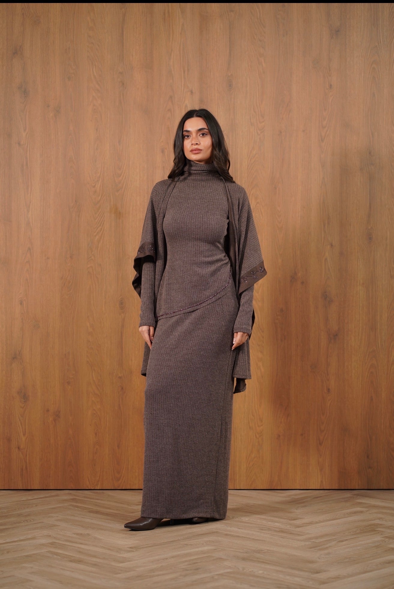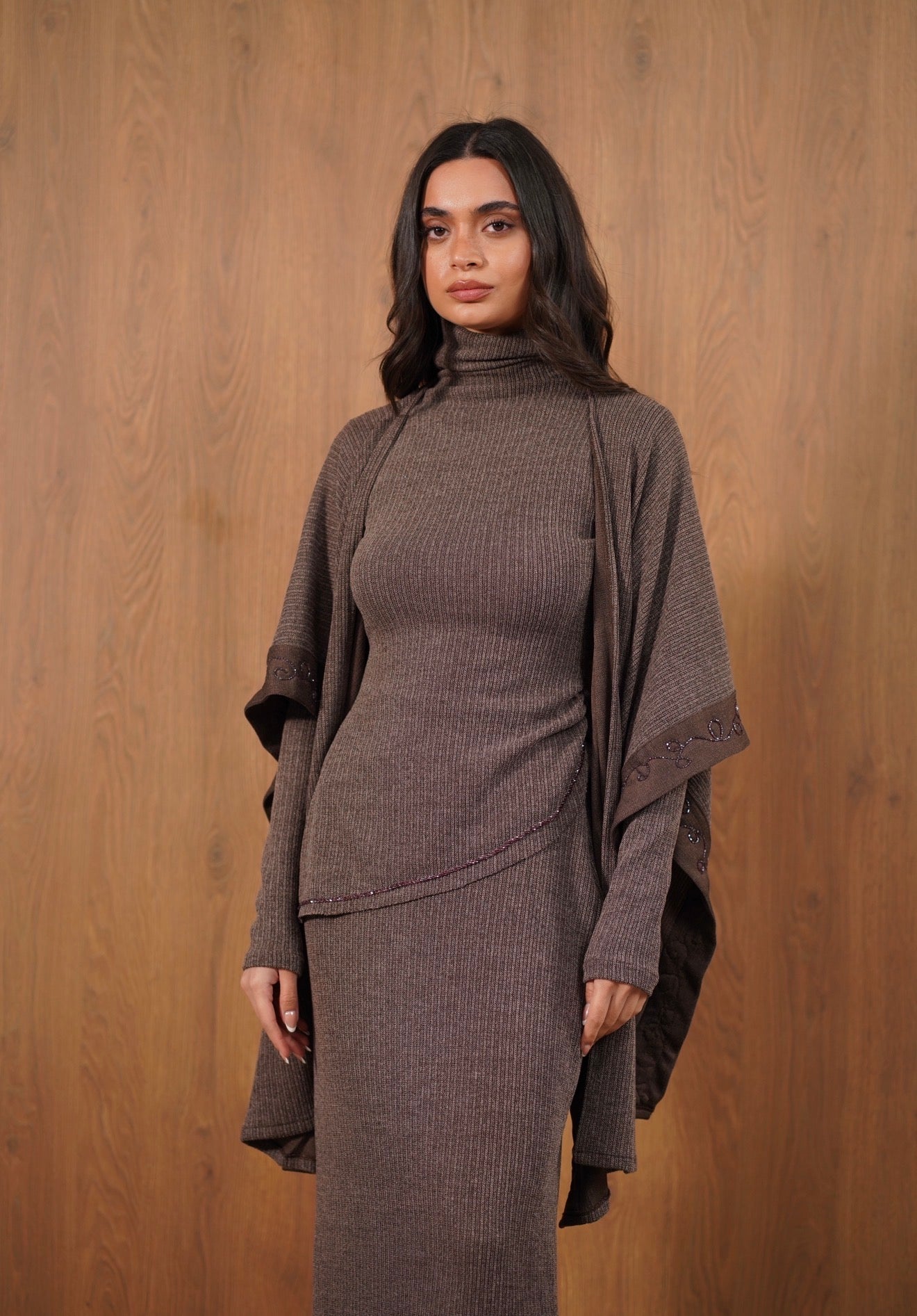 A sleek ribbed knit 3-piece featuring a fitted high-neck dress and a relaxed open cardigan with subtle embroidered details. Effortless, cozy, and timeless — designed for everyday elegance.
