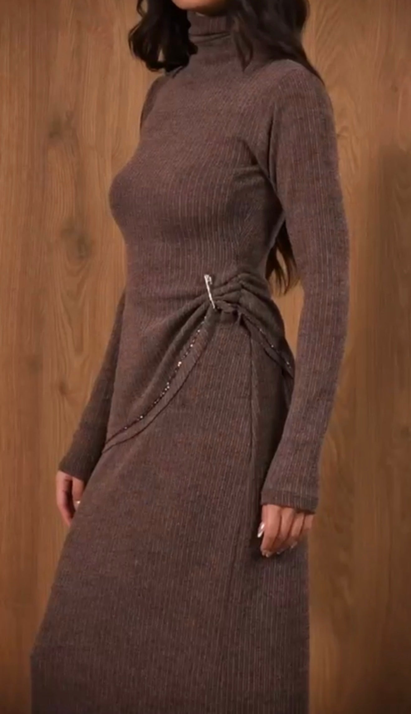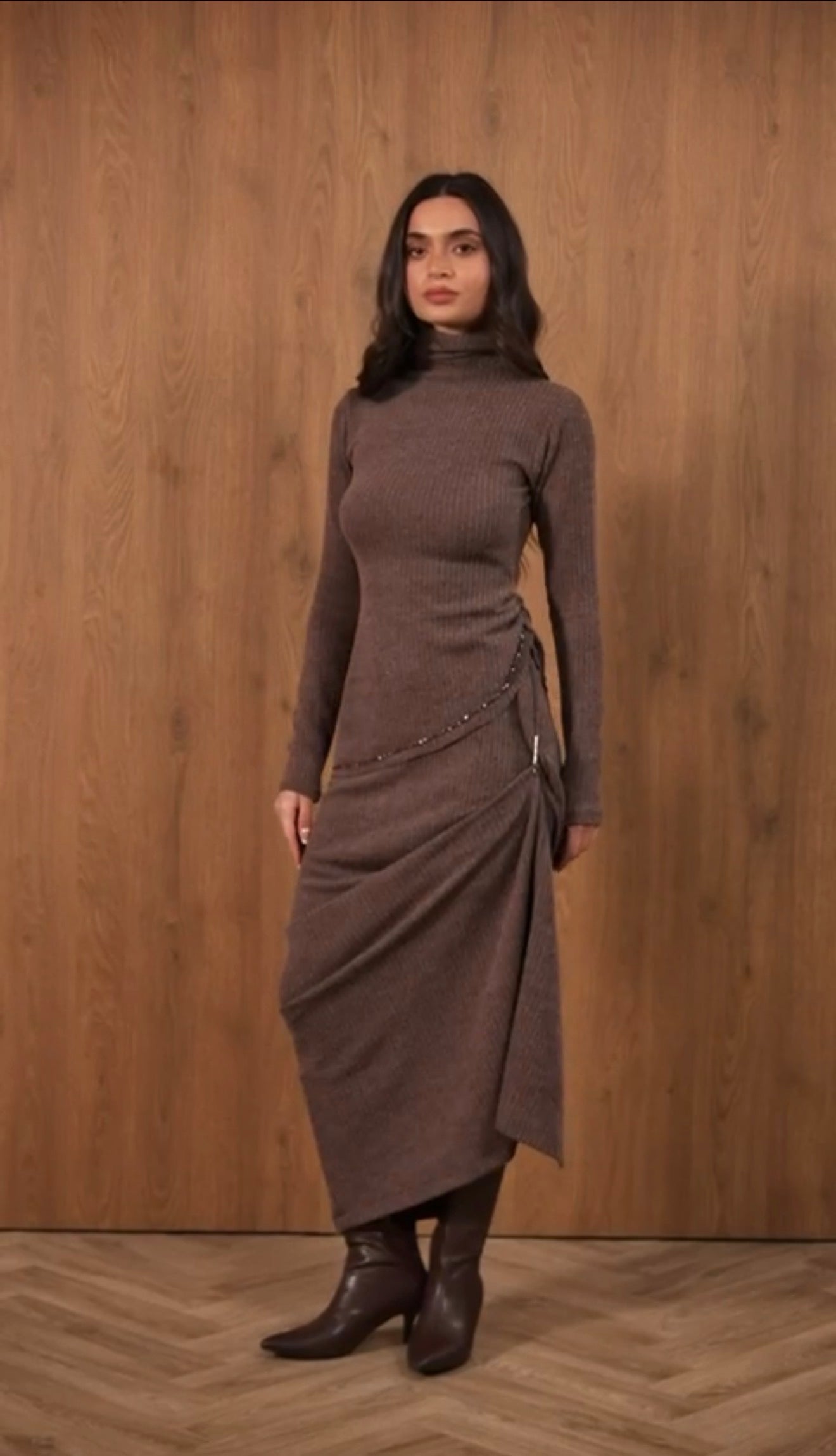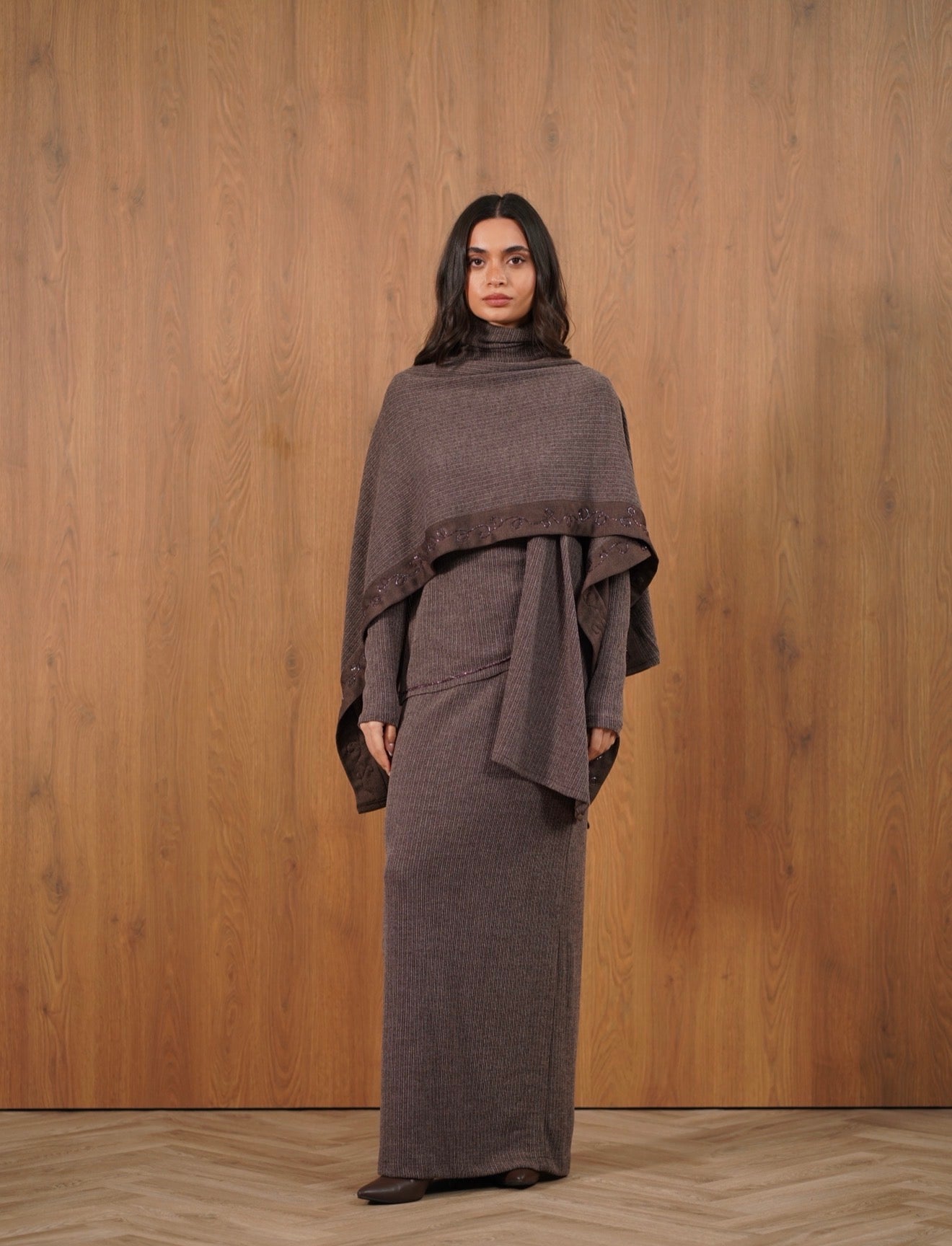 A sleek ribbed knit 3-piece featuring a fitted high-neck dress and a relaxed open cardigan with subtle embroidered details. Effortless, cozy, and timeless — designed for everyday elegance.